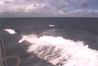 今天下午,海面比较平静,风浪和长浪均只有1-2m左右,灿烂的阳光斜射在白濑号的右舷上,被考察船飞溅起来的水花不时折射出呈半圆形的彩虹,美极了。我用24毫米的广角镜头,伏在右舷栏杆处,静静地等候,捕捉着拍摄的良机。我一直等了半个多小时,抓拍了三、四张。尽管浪花溅湿了衣服和镜头,我仍为抓拍了这奇景而欣慰。 当我刚刚拍完,站起来时,舰长奇迹般地出现在我面前。我一直认为只有我一人在欣赏,原来还有一位"知已"也在陪伴我。我高兴地对他说:"Wonderful!"舰长也兴奋地说:"Yes ,Great !"他希望我洗印出来后一定送他一张。舰长很有兴趣地又与我一道欣赏"宝光",可惜再也没出现完好的了。舰长感慨地说:"Mr.Gao I have found that you are very interest in the nature phenomena in Antarctic .I have been the Antarctic many times ,but I have naver seen the rainbow near our ship ."我答应回京后一定寄给他这些照片(后记:回京后的第一个元旦前,我寄了一张"宝光"照片给舰长),并说:"I am a meteorolgist .I should be interest in this nature phenanena ." |