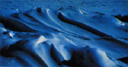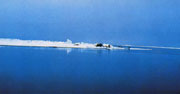 与南极一样,北极地区的陆地与岛屿上的茫茫冰盖,看上去辽远而宁静,似乎代表某种永恒的静止。但是实际上,由于冰雪自身的重量,陆地冰盖不断地向海岸方向移动,这种移动深沉缓慢而又无可阻挡。格陵兰岛内陆冰盖的年平均移动速度是几米,而在沿海则可达100~200米。至于那些巨大的冰川,运动速度就大得多了。所谓冰川,实际上就是冰雪的河流。数十亿至数百亿吨的冰雪在冰川运行的山谷或低地中静静地推挤着、摩擦着、移动着。它们缓缓地,但却一往无前地向大海流去,最后惊天动地般地崩落入海中。冰盖移动,最后崩落在海水中形成巨大的冰山。仅以这种方式,格陵兰岛的陆地冰盖每年损失的冰量达到150立方公里。另一方面,格陵兰岛每年通过降雪而累积的总冰量却是大约170立方公里。但是与南极的情况一样,到目前为止,科学家们还不能肯定回答,格陵兰岛的大陆冰盖究竟是在缓慢增长,还是在渐渐消亡。