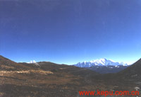 早饭后,带上雪杖,王维与我同行。离开转运站,沿着一条公路,我们向西南方前进,步行20多分钟,上一小山,坡不算陡,但已是在曲曲折折的小道上攀行了。过十多分钟,上到一小山脊,这儿树着一排排挂有经幡的旗杆,是一制高点,但见南峰被挡,不能拍照,我们再往西南方向上爬,钻过灌木丛,终于找到了好的拍摄点:南峰和加峰清晰可见,用35-28毫米的镜头正好。