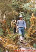 早晨9点许,从一号营地出发,一直上山,翻过一个约3040米的山口。我们一直在原始森林中穿行,两足基本上在树根上移动,时而从一根大的树干踏过,时而钻过横亘在前进道路上的一棵大树下,有趣极了。森林下长着一片片厥类植物。上山难,难在攀登需要力气,稍一加快,就要气喘吁吁。上山难,下山更难。翻过3040米的小山后,一直下坡,路陡又窄,每个人都几乎摔过跤。我虽然行走小心,但也摔了一跤,且正好碰在一块石头上。我的左腿在过去登山中受过伤,这一跤摔后,走路不便了,稍一着地用力,就隐隐作痛,只好尽量让右腿多负担点。总算坚持到了二号营地。