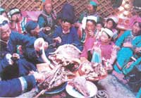 吃手抓羊肉最好的季节是秋天,此时草茂羊肥,蒙古族牧民每当贵客来临,在喝过奶茶之后,从羊群里挑选出膘肥肉嫩的羯羊,就地宰杀,扒皮入锅,只需两三碗奶茶的寒喧功夫,一大盘层层叠叠,热气腾腾的手抓羊肉就会摆在你的面前,在羊肉上还会插上几把锋利的藏刀。吃手抓羊肉,如果直接用嘴咬, 太不雅观,多用刀割着吃,如何用刀,也很有讲究。吃手抓羊肉,虽然吃得手滑嘴油,但仔细品味,爽而不腻,肥而不膻,油润肉酥,质嫩滑软,滋味不凡。吃手抓羊肉,没有煎炒烹炸一套功夫,看起来似有原始之感,但多次品味,会越吃越馋,使人很久难忘。这一吃法,与蒙古族及藏族同胞历史上长期以来游牧生活有关,因此法简单,加工制作比较容易,而且吃起来方便,一手抓肉,一手拿刀,割、挖、剔、片,可把羊骨头上的肉吃得十分干净。另外,手抓羊肉,其色、香、味、形也都代表着草原人民粗犷、豪放、热情、虔诚和好客的性格。到草原旅游,决不能不吃手抓肉。