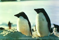 阿德利企鹅 阿德利企鹅(南极办资料) 身高 45~55厘米,体重4.5公斤,眼圈为白色,头部呈蓝绿色,嘴为黑色,嘴角有细长羽毛,腿短,爪黑。阿德利企鹅的名称来源于南极大陆的阿德利地,此地是1840年法国探险家迪·迪尔维尔以其妻子的名字命名的。阿德利企鹅是分布最广、数量最多的企鹅。其繁殖季节在夏季,雌企鹅每次产2枚蛋,雌企鹅孵蛋,孵蛋期为两个来月,通常只有一只小企鹅成活,小企鹅2个月大即可下水游泳。 皇帝企鹅 阿德利企鹅 金图企鹅 帽带企鹅 王企鹅 喜石企鹅 浮华企鹅 [上一页] [下一页]