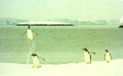 企鹅不会飞,善游泳。在陆上行走时,行动笨拙,脚掌着地,身体直立,依靠尾巴和翅膀维持平衡。遇到紧急情况时,能够迅速卧倒,舒展两翅,在冰雪上匍匐前进;有时还可在冰雪的悬崖、斜坡上,以尾和翅掌握方向,迅速滑行。企鹅游泳的速度十分惊人,成体企鹅的游泳时速为20~30公里,比万吨巨轮的速度还要快,甚至可以超过速度最快的捕鲸船。企鹅跳水的本领可与世界跳水冠军相媲美,它能跳出水面2米多高,并能从冰山或冰上腾空而起,跃入水中,潜入水底。因此,企鹅称得起游泳健将,跳水和潜水能手。
