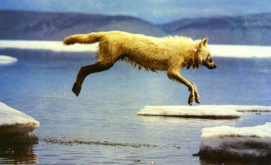 北极狼在浮冰间跳跃