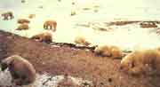 对于爱斯基摩人来说,北极熊是他们最可怕的敌人,在枪支没有传入之前,若遇到北极熊的袭击,十有八九要葬身熊口。为了使人们在与北极熊不期而遇时不至于惊慌失措,这里简单介绍一个北极熊袭击人时的特点。一般说来,具有进攻性的北极熊常常显得急躁不安,并从鼻孔里断断续续喷出粗气,这时,人们就要小心,设法赶走北极熊,最简单的方法是尽量大喊一声,并不断向其投掷冰块、石块,附以敲打铁器的声音。切忌见熊便跑,这是最愚蠢的举动,正中北极熊的下怀,它会以极快的速度追赶上来,来一个恶“熊”捕食,接着一记熊掌,人的头颅便会开花。所以在北极熊出没的地方进行考察和工作时,最好随身携带枪支,以免发生意外。而对于慢慢腾腾,动作随便,头部前伸,东闻西嗅,一副悠然自得样子的北极熊,便不必大惊小怪,因为此时,它并无恶意。当然,同喜怒无常的野兽打交道,还是小心为妙。