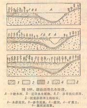 老年期,由于沉积物大量充填湖盆,沉积物以湖泊相沉积和沼泽相沉积为主,沉积作用大于下陷作用,水域进一步缩小和变浅,水生植物大量繁殖,沉积物中含有大量的植物根系和植物残体,最后湖泊演化为沼泽。