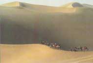 从甘肃省敦煌县城往南约5km,便可看到连绵起伏,如虬龙蜿蜒的沙山。沙山东西长达40多km,南北宽20km,最高峰相对高度达250m。山峰陡,山梁锐。山上有水波似的沙纹。从山顶往下滑,沙砾随人体而颓落,会发出隆隆的响声。据史书记载,即使是晴朗的天气,风停沙静,沙山也会发出丝竹管弦之音。这就是称之为“沙岭晴鸣”景致的鸣沙山。