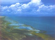 青海湖系洼地聚水而成,形似梨状。湖面水位3193.92 m,最大水深27.0 m,平均水深17.9 m,是名副其实的高原湖泊,湖面面积4340.0