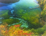 ¡¡¡¡¾ÅÕ¯¹µºþË®Öк¬ÓдóÁ¿µÄ̼Ëá¸ÆÖÊ£¬ºþµ×ºþµÌ¾ùϵÈé°×É«µÄ̼Ëá¸Æ½á¾§£¬À´×ÔѩɽµÄÈÚË®¡¢ÉÁÖÁ÷Ȫ£¬Ê¹ºþË®Òì³£½à¾»£¬ÔÙ¼ÓÉÏÌݺþµÄ²ã²ã¹ýÂË£¬ÆäˮɫÇ峺Èç¾µ£¬À¶±Ì¾§Ó¨¡£ºþÖÐË®Ô壬¹à´Ô·±Éú£¬ºþµ×É«²Ê°ß쵵ijÁ»ýʯÔÚÑô¹âÕÕÉäÏ£¬³ÊÏÖ³öÀ¶¡¢»Æ¡¢³È¡¢Â̵ÈÉ«²Ê£¬Ñ¤Àö¶áÄ¿¡£Õ¿À¶µÄÌì£¬Òø°×µÄ·å£¬´äÂ̵ÄÁÖ£¬Ò»Æëµ¹Ó³ºþÖУ¬ÈçÊ«È绣¬¿°³Æ¡°ÌìϵÚһˮ¡±¡£