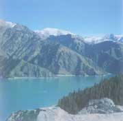 在新疆,经纬度N43°53ˊ,E88°08ˊ的地方,乌鲁木齐以东的东天山高耸的博格达山上,静静的躺着一个当地人们(昌吉回族自治州,阜康县)俗称的“大海子”。那是神话传说中王母娘娘入浴之池,古称“瑶池”。又说是王母娘娘梳妆台上的一面镜子,清乾隆年间取“天镜”、“神池”之意,命其为“天池”。为了同东北长白山天池区别,俗称“天山天池”或“阜康天池”。