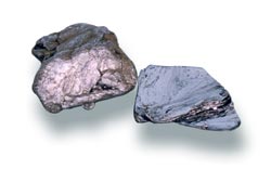 辉钼矿化学成分为MoS2,晶体有不同类型,分属六方和三方晶系的硫化物矿物。呈铅灰色,表面上看像铅,条痕为亮铅灰色,强金属光泽。通常呈叶片状、鳞片状集合体。一组极完全底面解理。摩氏硬度约为1-1.5,比重大,达5。薄片具挠性。在光薄片下,不透明,有白色到灰白色的强烈多色性和非均质性。与石墨相似,但以其密度较大、光泽较强、颜色及条痕较淡与石墨相区别。