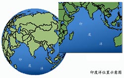 印度洋在亚洲、非洲、大洋洲和南极洲之间,是世界第三大洋,总面积7491.7万平方公里,约为海洋总面积的1/5。它的平均深度为3897米,最深为7729米。印度洋北部是封闭的,南段敞开。西南绕好望角,与大西洋相通,东部通过马六甲海峡和其他许多水道,可流入太平洋。西北通过红海、苏伊士运河,通往地中海。