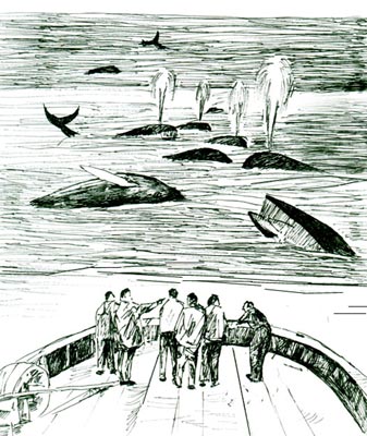 “挑战者”号在南极附近海域发现鲸群在周围喷起水柱