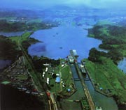 巴拿马运河位于美洲巴拿马共和国的中部,它是沟通太平洋和大西洋的重要航运要道。巴拿马运河全长81.3千米,水深13米~15米不等,河宽150米至304米。整个运河的水位高出两大洋26米,设有6座船闸。船舶通过运河一般需要9个小时,可以通航76000吨级的轮船。