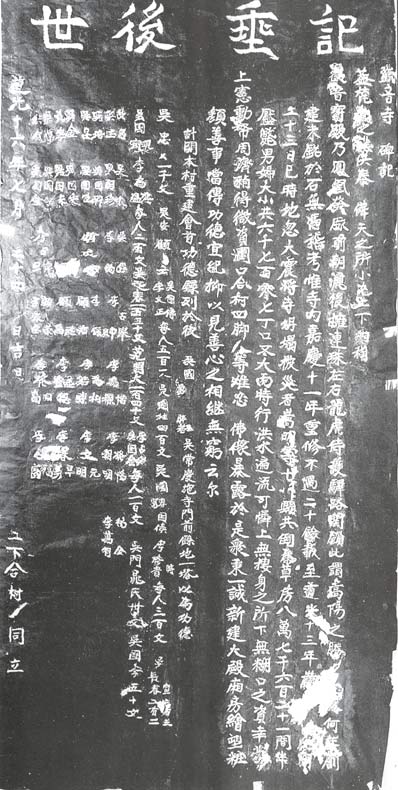 观音寺碑记 清道光十六年(1836年)七月二十四日 观音寺碑 云南嵩明小屯 巳时地忽大震,将寺坍塌。被灾者蒿明等七州县共倒瓦草房八万七千六百二十一间半,压毙男妇大小共六千七百零七丁口,又大雨时行,洪水遍流,可怜上无栖身之所,下无糊口之谈。