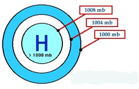 (2)¸ßÆøÑ¹(¼ò³Æ¸ßѹ)£¬ÆäµÈѹÏ߱պϣ¬ÖÐÐÄÆøÑ¹¸ß£¬ÏòÍâÖð½¥¼õµÍ¡£¿Õ¼äµÈÑ¹ÃæÏòÉÏ͹ÐÎ×´£¬ÐÎËÆÉ½Çð¡£