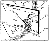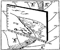 (2)第二型冷锋天气模式:这是一种移动快、坡度大(1/40-1/80)的冷锋。锋后冷空气移动速度远较暖气团为快,它冲击暖气团并迫使产生强烈上升。而在高层,因暖气团移速大于冷空气,出现暖空气沿锋面下滑现象,由于这种锋面处于高空槽后或槽线附近,更加强了锋线附近的上升运动和高空锋区上的下沉运动。夏季,在这种冷锋的地面锋线附近,一般会产生强烈发展的积雨云,出现雷暴、甚至冰雹、飑线等对流性不稳定天气。而高层锋面上,则往往没有云形成。所以第二型冷锋云系呈现出沿着锋线排列的狭长的积状云带,好似一道宽度约有十公里,高达十多公里的云堤。在地面锋线前方也常常出现高层云、高积云、积云。这种冷锋过境时,往往乌云翻滚,狂风大作,电闪雷鸣,大雨倾盆,气象要素发生剧变。这种天气历时短暂,锋线过后,天空豁然晴朗。在冬季,由于暖气团湿度较小,气温不可能发展成强烈不稳定天气,只在锋线前方出现卷云、卷层云、高层云、雨层云等云系。当水汽充足时,地面锋线附近可能有很厚、很低的云层,和宽度不大的连续性降水。地面锋过境后,云层很快消失,风速增大,并常出现大风。在干旱的季节,空气湿度小,地面干燥、裸露,还会有沙暴天气。这种冷锋天气多出现在我国北方的冬、春季节。