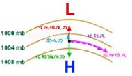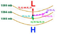 等压线往往是无规则的曲线。为了典型起见,我们假定等压线是同心圆。在这样的气压场中,空气受到水平气压梯度力的作用,力的方向是垂直于等压线由高压指向低压。