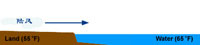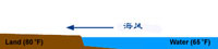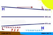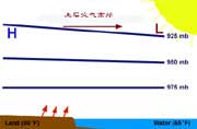 在海滨地区,只要天气晴朗,白天风总是从海上吹向陆地;到夜里,风则从陆地吹向海上。从海上吹向陆地的风,叫做海风(左上图);从陆地吹向海上的风,称为陆风(右上图)。气象上常把两者合称为海陆风。