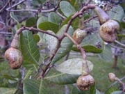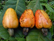 腰果比较耐旱,每年可开三次花,结三次果,花为黄色,并有淡红色条纹。对于不懂植物学的人来说,腰果给人的感觉很奇怪,它的种子长在果子的外面,接在下端。实际上,我们平常当作水果吃的那一部分并不是真正的果子,而是果托,也叫作假果,而真正的果子是被我们叫作种子的那一部分。腰果的形状有点象梨果,但体形小得多,生时绿色,成熟时逐渐变红,吃起来甘甜多汁,略有涩味,营养很丰富,经济价值也很高。