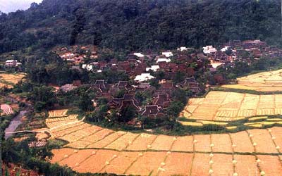 citratus)等。在一个园子中,植物高低错落,有水果、蔬菜、香料、药用和观赏植物,它们各得其所。住户们可以利用一些空间栽培和管理它们。其产品除了满足自家生活所需外,还与亲戚、邻居互相馈送或拿到集市上出售。据统计,在西双版纳所有家庭的庭园中,栽培的植物有四五百种,这些庭园成了栽培植物的重要基因库。中科院西双版纳热带植物园的科技人员就从这些庭园中引种和选育了一些重要经济植物,如重要香精植物依兰香(Cananga