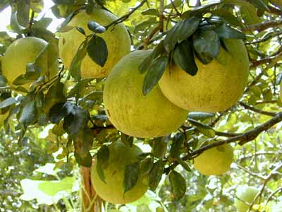柚子为芸香科常绿乔木,高5—10米,叶常绿,每片叶子由一大一小两片叶片组成,形似葫芦;花期2—5月,花朵繁多,洁白清香,用“忽如一夜春风来,千树万树犁花开”来形容,一点也不为过;果实硕大,扁球形或梨形,最重者可达3公斤,果皮光滑,绿色或淡黄色。在西双版纳,柚子被人称为“泡(pao)果”。近年来,植物园的科技人员在长期实践的基础上,培育出许多优良品种的柚子,如“曼赛龙”、“勐仑柚”、“东试早”等,这些果子个体大,水分多,味酸甜,深受人们喜爱,并畅销省内外,现已在当地推广种植数百万亩,收到了良好经济效益。