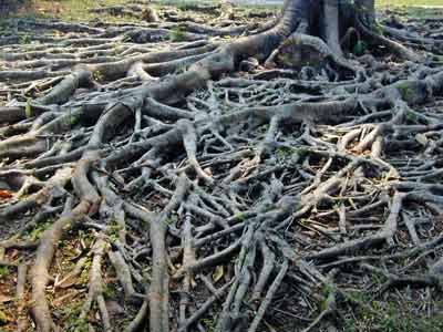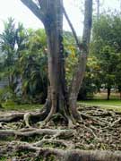 原来,印度胶榕为了满足根的呼吸,支撑高大的地上部分,并阻止别的生物种入侵自己的领地,就利用发达的根系尽量向土表延伸、扩张,直至裸露地面,并逐渐相互愈合,联为网状。如果从高处俯视印度胶榕的整个根系,你一定会感到十分惊讶:密密麻麻,高低错落,奇形怪状,千姿百态,好似一张大网紧紧地罩住一大片圆形的地面。