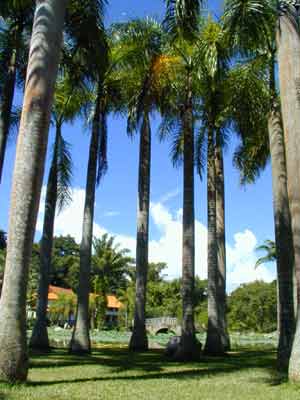 棕榈科大乔木王棕树形十分独特美观,两头细,中间粗,基部又膨大,象花瓶,如导弹,又似西双版纳傣族的象脚鼓。植物园中心有一片王棕,已种植多年,树干粗壮,枝繁叶茂,远远望去犹如一排排面向蓝天整装待发的导弹,所以这里也常常被游人戏称为“导弹基地”。