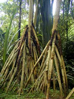 还好,自然界因“怕”说不清而在西双版纳留下了数十种植物作为活见证,露兜树就是其中很有说服力的一种。古地中海消失后,它“认为”西双版纳这块土地好而没有跟它的家族一起迁移到有海的地方去,经过长期的磨练、演化,成为了后来发育起来的热带雨林的成员,并逐步适应了热带雨林酸性的土壤、潮湿而较阴暗的林内环境,而且还改变了非海边不能生长的习性。然而,也许是“江山易改而习性难移”的某些遗传基因还在起作用吧,它在树干的下部还要长出很多气生根并发展成为支柱根,保持它原来生长在海滨滩涂上为了“呼吸”和支撑地上植株的习性。