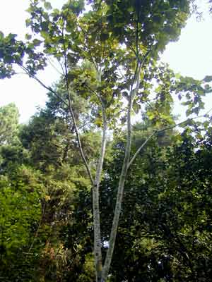 轻木不仅木材特别轻,木质细白,虫不吃,蚁不蛀,而且生长迅速,树干又高又直,分枝少,叶片大而圆。在热带雨林里,它宛若着紧身短衣筒裙、系银腰带、撑着绿纸伞的傣族少女,窈窕美丽,亭亭玉立。