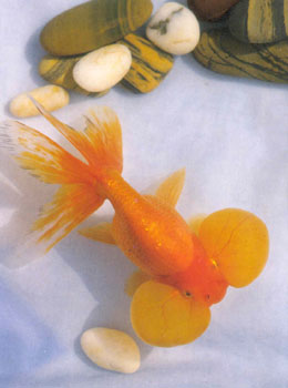它来自红蛋种的变异,先形成具有微凸小泡的蛤蟆头,再选育出泡大的水泡眼,在金鱼中极为名贵。形状与一般蛋种相似,唯在眼球下生有一个半透明泡泡,泡内充满液体,故名水泡。这种泡是从眼球下生出的,因眼眶大、眼球小,而水泡却十分发达,凸出于眼眶外。普通有两种:一种硬泡,即凸出的泡并不大,有的还外被质膜;另一种为软泡,此种不但泡特别发达,而且将眼球挤得半朝上的样子,好像一条小眼的朝天龙。泡膜很薄,上面分布着线状的微血管清晰可数,由于大而薄,当游动时,宛如两只大灯笼,左右颤动,姿态动人。身躯多为红色,近年又有其他变化出现,但水泡终不及红色的大。根据多年饲养记录,泡大加鸽蛋的极少,所以更显得名贵,最受人赞赏。选择时,要求泡大,左右对称,有的金鱼幼时泡泡生长很好,到两、三年后,却会出现左右大小不一;但也有初生时并不太好,但两、三年反而趋向对称的例子。本品种在生长速度上也和一般蛋种不同,比较迟缓,尤其泡大身短者,身体重心前移,常作伏底状,若三、四年后,仍能保持正常,那就难能可贵了。出现的品种有:花水泡、白水泡、蓝水泡、玻璃水泡等,而近年新出现的色彩较之前大为丰富,更受喜爱。