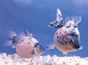 原作橄榄形,尾鳍有长短之分。前些年江苏扬州首次选育出一种腹圆如球的珍珠鱼,唯珠鳞尚欠丰满;福州养殖爱好者在此基础上,精心培养出一种头形短缩,尾鳍短小、腹圆如鼓的珍珠鱼,像一个滚圆的球体。因腹圆,珠鳞更为凸出,形体近似热带鱼。尾小,游动缓慢,如同一只球体在缓缓滚动,非常有趣。此鱼极其难养,宜浅水,勤喂饲(尤其活饵料),少食多餐是促进发育的关键。此鱼体色五花,唯色斑较浓。近年新育成一种具有透明鳞、体色蓝白、色斑细碎的新品,使人感到明快活泼。