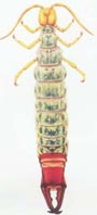 触角念珠状,内藏的咀嚼式口器;没有复眼和单眼色。体长2-20毫米,我国西藏有一种铗尾虫,体长竟达49毫米,为世界所罕见。体白色或黄色。前胸小,中、后胸相似。跗节1节,有2-3爪。腹部11节,前7节有成对的刺突和泡囊。尾须发达,其中尾须线状的种类叫双尾虫;尾须骨化成钳状的种类叫铗尾虫(仿陈瑞瑾图)。本目有时被提升为双尾纲。