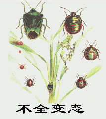 4、不全变态:这种变态类型只有3个虫期,即卵期、幼虫期和成虫期。成虫期的特征随着幼期的生长发育而逐渐显现,翅在幼期的体外发育。不全变态与原变态的主要不同点为:成虫期不再脱皮,幼虫期为寡足型(只有3对胸足,无腹足)。最典型的不全变态类昆虫有:直翅目、等翅目、竹节虫目、螳螂目、蜚蠊目、革翅目、啮齿目、纺足目、半翅目、同翅目等。这些昆虫的幼虫陆生,称为若虫。蜻蜓目、绩翅目的幼虫水生,因而其幼虫比较特化,称为稚虫(据彩万志图修改)。