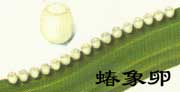 草蛉的卵,在卵下方有一根丝状长柄,长柄基部粘在植物叶 片上,将卵高高举起。卵粒在柄的顶端,呈白色或淡绿色。单个或数个产在一张叶片上,卵粒重而丝柄长,柄具弹性,微风吹来,随之摇摆,十分好看。