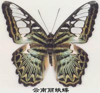 中等大小。前翅长40毫米,翅面灰绿色,自翅基部向外有纵行斜带,前线下方至中室内侧呈棕黑色,内有3个不规则的淡黄色斑,中室以外至外线间有白色宽带,棕褐色的翅脉极为明显,外线至外缘间棕黄色,内有黑色横纹,外缘镶有黑白相间的缘毛;后翅基部粉绿色,中线由黑色斑点组成,外线呈放射性纵纹及三角形黑斑,外嵌淡黄色边,外缘黑白相间,构成极为美丽的图案,双翅半垂半拢时尤为美观。分布于西南边陲的亚热带地区。