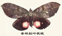 体长45一47毫米;翅展127-131毫米。头部及胸部暗棕色,头及颈板带紫灰色,胫节基部有黄白点;腹部黑棕色,背面有蓝色闪光。前翅暗棕色,有霉褐色调,散布黄白点;环纹为1黑点;肾纹大,褐色,后部内突,中央有黑棕纹;在中室下角外及肾纹外后角处各1条白纹,翅尖至3脉近基部有1霉褐色斜线,5脉中部至臀角有1条波状线。后翅黑棕色,有蓝色闪光,近臀角有1块大红斑,中央白色。雌蛾前翅一色。