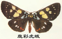 体长26-29毫米;翅展67-74毫米。头部及胸部黑色,下唇须第一、第二节、额两侧及触角基部各有1白斑;复眼后衬白色,头顶有1白斑,颈板、翅基片及前胸有粉黄斑;腹部桔红色。背面基部黑色,其余各节有黑横条;前翅黑色,基部有二列粉蓝斑,在后缘处相连,中室基部一嫩黄小斑,中部一嫩黄大方斑,其后连一同色大方斑,外区前半有二组长方形嫩黄斑,亚端区一列白斑。后翅黑色,亚端区一列蓝白斑,在2脉后为二桔红斑。