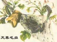 每年发生一代,以卵越冬,来年早春孵化。幼龄幼虫群居,在枝条及叶间吐丝织网作巢(即称天幕),夜间为害,白天躲进巢内;老熟幼虫分散为害,幼虫六龄、约45日,在叶间结双重茧化蛹。蛹期14天,7-8月间成虫羽化,产卵于细枝条上,排列成环,每卵块约100-400粒。成虫有趋光性。幼虫取食较杂,主要为害苹果、李、杏、梨、桃、樱桃、柞树、样、榆及榆叶梅、丝棉木、栋树、橡树等。