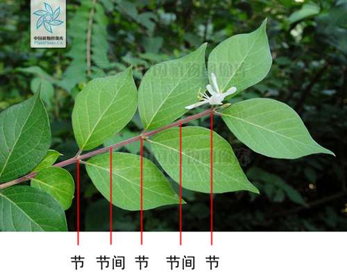 茎上着生叶的位置叫节,两节之间的部分叫节间。茎顶端和节上叶腋处都生有芽,当叶子脱落后,节上留有痕迹叫做叶痕。这些茎的形态特征可与根相区别。
