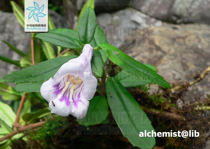 苦苣苔科,多年生草本。莲座状基生叶,狭椭圆形;聚伞花序下垂,花粉红色。生于阴湿岩面或石缝中。野生观赏花卉。产于浙江、安徽等省。