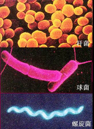 细菌根据形状分为球菌(coccus)、杆菌(bacillus)和螺旋菌(spirillum)。球菌直径0.15~2μm,杆菌长度1.5~10μm,直径0.5~1.5μm。细菌多成群存在,这种成群的细菌称为细菌菌落。有些细菌成单列细胞的丝状,有时分叉。有些丝状细菌,菌丝呈无隔分枝状,称为放线菌。许多细菌在生活史中有一个时期常生有鞭毛,能游动。鞭毛着生的位置、数量因种类而异,一般杆菌、螺旋菌有鞭毛,球菌多数无鞭毛。