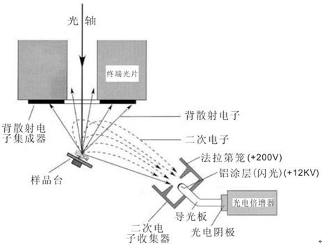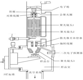 电子光学系统由电子枪、电磁透镜、扫描线圈和样品室等部件组成。电子光学系统的作用是获得扫描电子束,作为信号的激发源。为了获得较高的信号强度和图像分辨率,扫描电子束应具有较高的亮度和尽可能小的束斑直径。