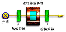 原来没有旋光性的透明介质,如水、铅玻璃等,放在强磁场中,可产生旋光性,这种现象称为法拉第效应。具体的现象是,把磁光介质放到磁场中,使光线平行于磁场方向通过介质时,入射的平面偏振光的振动方向就会发生旋转,转移角度的大小与磁光介质的性质、光程和磁场强度等因素有关。