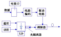光发送机由输入接口、光源、驱动电路、监控电路、控制电路等构成,其核心是光源及驱动电路。在数字通信中,输入电路将输入的信号(如PCM脉冲)进行整形,变换成适于线路传送的码型后通过驱动电路光源,或者送到光调制器调制光源输出的连续光波。为了稳定输出的平均光功率和工作温度,通常要设置一个自动的温度控制及功率控制电路。如光发送机框图所示。