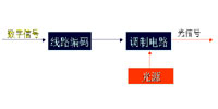 从PCM设备(电端机)送来的电信号是适合PCM传输的码型,为HDB3码或CMI码。信号进入光发送机后,首先进入输入接口电路,进行信道编码,变成由“0”和“1”码组成的不归零码(NRZ)。然后在码型变换电路中进行码型变换,变换成适合于光线路传输的mBnB码或插入码,再送入光发送电路,将电信号变换成光信号,送入光纤传输。