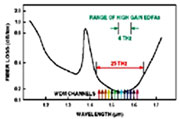 2.5Gb/s系统为例,在光纤的带宽中只占很小一部分,大约只有0.02nm左右;全部利用掺铒光纤放大器EDFA的放大区域带宽(1530~1565)nm的35nm带宽,也只是占用光纤全部带宽(1310~1570nm)的1/6左右。