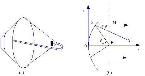 它可用图(b)表示。假设P为抛物线上的任意一点,过P点作平行z轴的直线,过焦点F作平行于x轴的直线,两者交于M点。作P点处法线PS,则PS与PM的夹角为θ1,PF与OF的夹角为θ0。只要证明θ0=2θ1 ,即FP与PS之间的夹角也为θ1,就可以得出PM为FP的反射线。