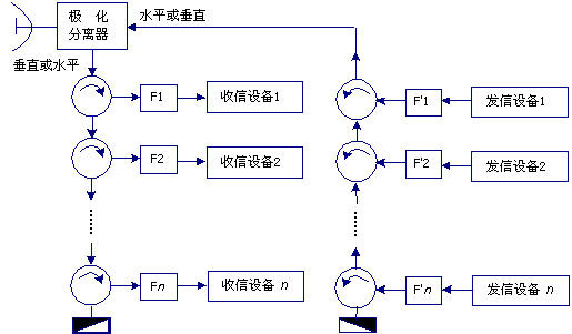 一条微波线路通常允许多个波道同时工作,为了使同一方向上的多个波道实现公用一副天线,就得在各波道收发信机与馈线之间接入多波导公用器。目前的多波道共用器大多采用分、并波道滤波器。分波道滤波器用于收信,其作用是将天线接收到的多波道信号分离,送往各波道相应的接收设备;并波道滤波器则用于将各波道发信设备输出的信号进行合并送往天线。如下图所示。