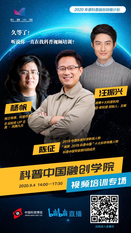 2020年9月4日14:00-17:30 科普中国融创学院科普视频培训专场正式开启?;疃?/span>中国科普博览、bilibili联合举办。